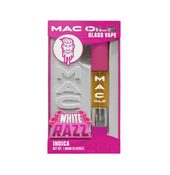 In the effervescent arena of cannabis vaping, the Mac Oils – White Razz Cart 1g shines as a stellar offering from Mac Pharms, the meticulous maestros behind extracts that marry potency with palatability. This 1-gram 510-thread cartridge distills the lively essence of White Razz, a sativa-dominant hybrid (roughly 70% sativa/30% indica) forged from the timeless union of White Widow and Raspberry Kush—yielding a strain that’s as visually striking as its frosty, trichome-draped buds suggest. With a commanding 87.1% THC concentration in its pristine distillate, it delivers a refined, full-spectrum high that’s invigorating yet forgiving, perfect for those navigating the day with a dash of delight or easing into evening without excess inertia. For the sativa seeker craving clarity amid chaos, this cart converts casual inhales into cascades of creative energy and subtle serenity, all wrapped in an all-glass design that prioritizes purity and portability.